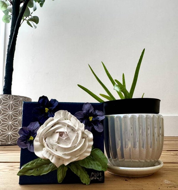 Commission: Acrylic paint 3D rose and african violets on 5"x5"x painted canvas